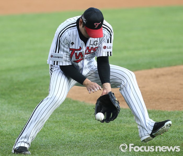 (서울=포커스뉴스) 2일 서울 잠실구장에서 열린 2016 프로야구 KIA-LG 경기 1회초 무사 2루에서 LG 투수 류제국이KIA 강한울의 희생번트 타구를 잡고 있다.