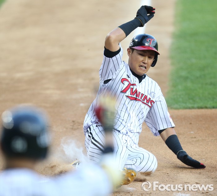 (서울=포커스뉴스) 2일 서울 잠실구장에서 열린 2016 프로야구 KIA-LG 경기 2회말 1사 3루에서 LG 오지환의 우익수 희생플라이때 3루주자 채은성이 슬라이딩하며 홈인하고 있다.