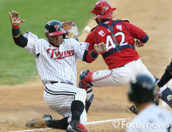 | △ 홈에서 슬라이딩하는 LG 히메네스 |