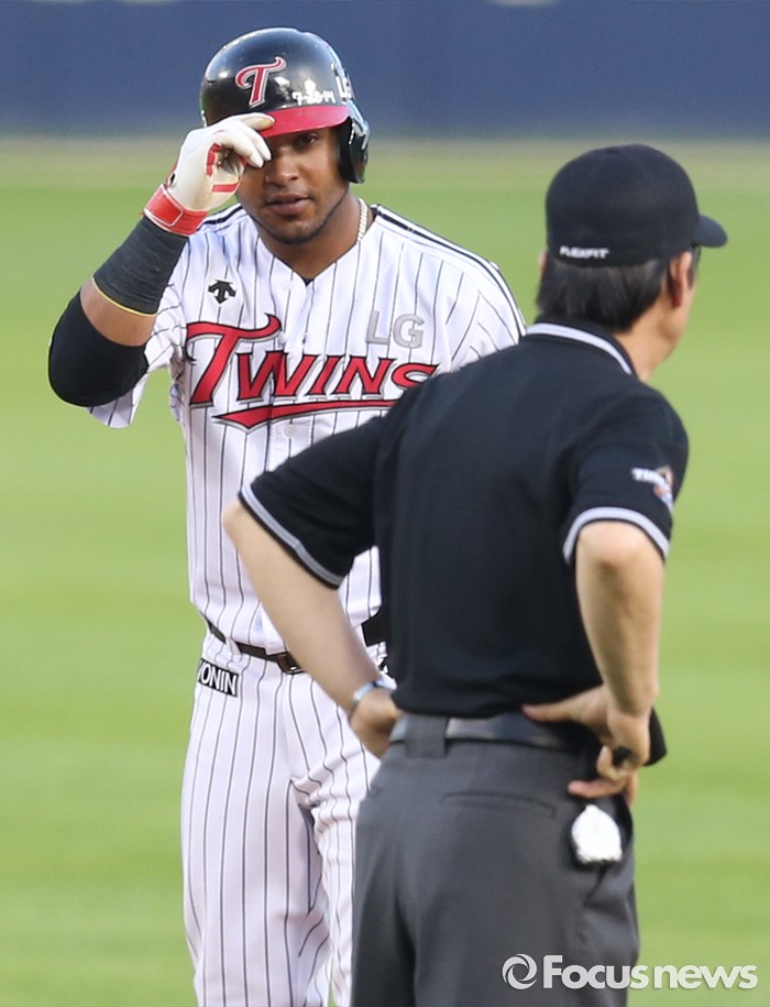 (서울=포커스뉴스) 2일 서울 잠실구장에서 열린 2016 프로야구 KIA-LG 경기 3회말 무사 1,2루에서 LG 히메네스가 1타점 2루타를 치고 김광회 2루심에게 인사하고 있다.