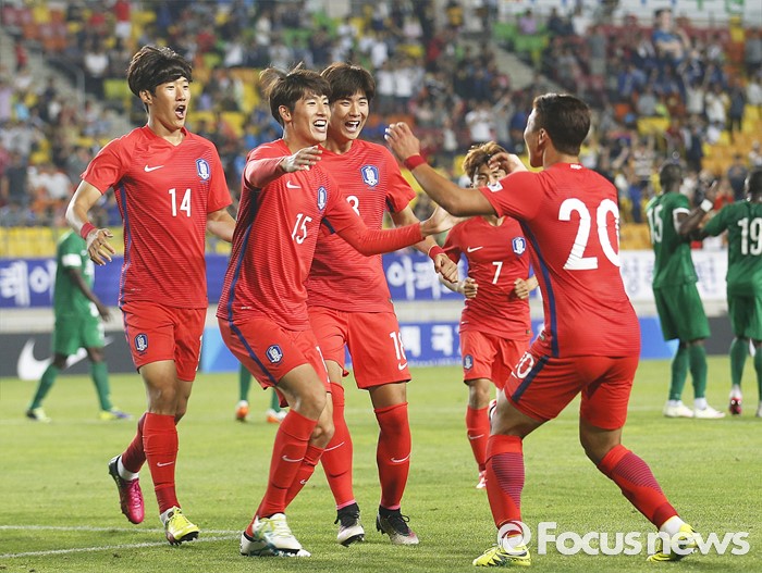 (수원=포커스뉴스) 2일 오후 경기 수원월드컵경기장에서 열린 2016 4개국 올림픽국가대표 축구대회 대한민국과 나이지리아의 경기에서 대한민국 최규백이 후반전 선제골을 넣고 선수들과 환호하고 있다.