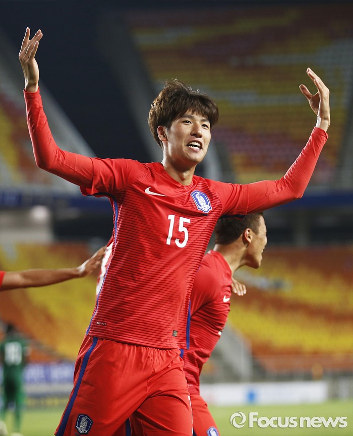(수원=포커스뉴스) 2일 오후 경기 수원월드컵경기장에서 열린 2016 4개국 올림픽국가대표 축구대회 대한민국과 나이지리아의 경기에서 대한민국 최규백이 후반전 선제골을 넣고 세레모니를 하고 있다.