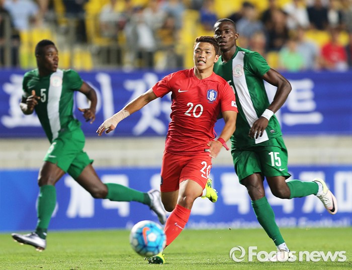(수원=포커스뉴스) 2일 오후 경기 수원월드컵경기장에서 열린 2016 4개국 올림픽국가대표 축구대회 대한민국과 나이지리아의 경기에서 대한민국 황희찬이 드리블을 하고 있다.