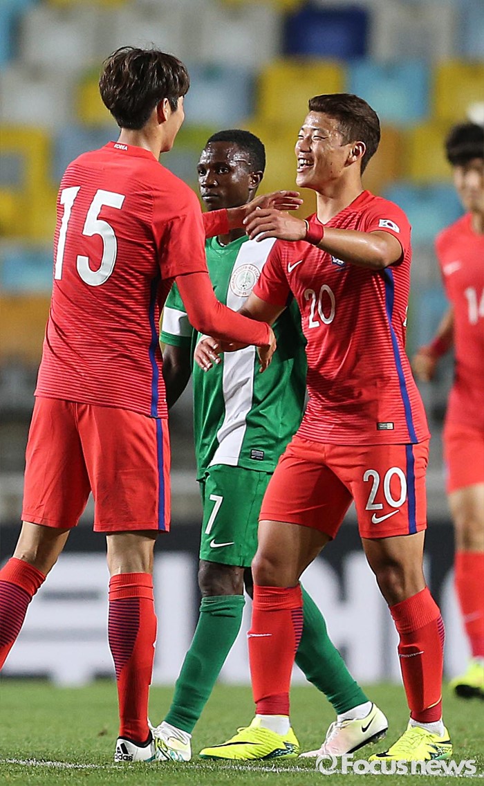 (수원=포커스뉴스) 2일 오후 경기 수원월드컵경기장에서 열린 2016 4개국 올림픽국가대표 축구대회 대한민국과 나이지리아의 경기에서 경기가 끝난 후 대한민국 황희찬(오른쪽)과 결승골을 성공시킨 최규백이 포옹하고 있다.