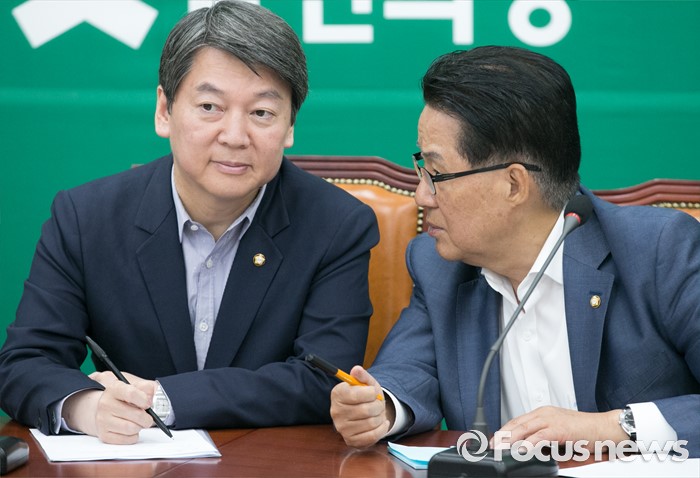(서울=포커스뉴스) 3일 오전 서울 여의도 국회에서 열린 국민의당 최고위원회의에 참석한 안철수(왼쪽) 상임공동대표와 박지원 원내대표가 대화하고 있다.