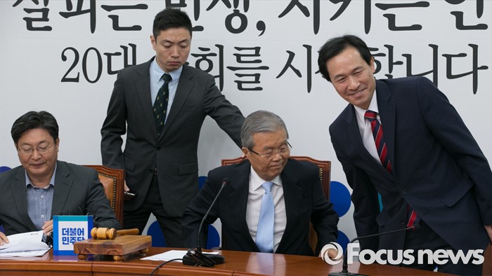 (서울=포커스뉴스) 3일 오전 서울 여의도 국회에서 더불어민주당 비상대책위원회의를 마친 뒤 김종인(가운데) 비대위 대표와 우상호(오른쪽) 원내대표, 이춘석 비대위원이 퇴장하고 있다.