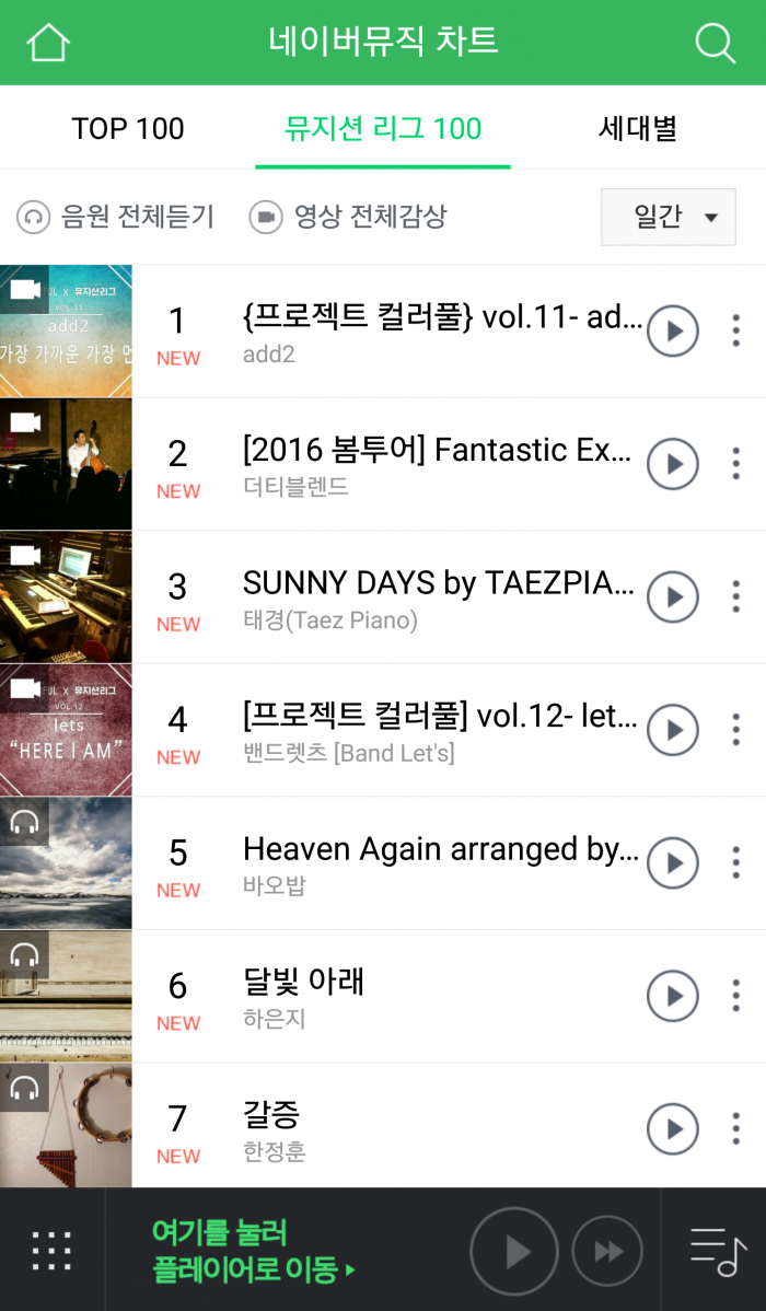 네이버는 뮤지션들의 등용문으로 자리잡은 뮤지션리그의 미 발표 창작곡을 중심으로 '뮤지션리그 톱100' 차트를 신설한다고 3일 밝혔다. 이용자들이 가장 많이 찾는 톱100과 나란히 위치 시켜 인지도를 높이고 대중들이 간편하게 뮤지션리거들의 음악을 더 많이 접할 수 있게 할 계획이다.