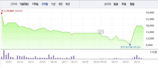 현대상선은 5월27일과 28일, 31일, 그리고 6월2일 각각 가격제한폭인 29.65%, 29.92%, 13.56%, 3.14%의 상승폭을 기록한 바 있다.
