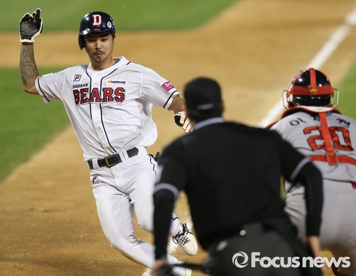 (서울=포커스뉴스) 3일 서울 잠실구장에서 열린 2016프로야구 SK-두산 경기 6회말 1사 1,3루에서 두산 김재호의 좌익수 희생플라이때 3루주자 오재원이 슬라이딩하며 홈인하고 있다.