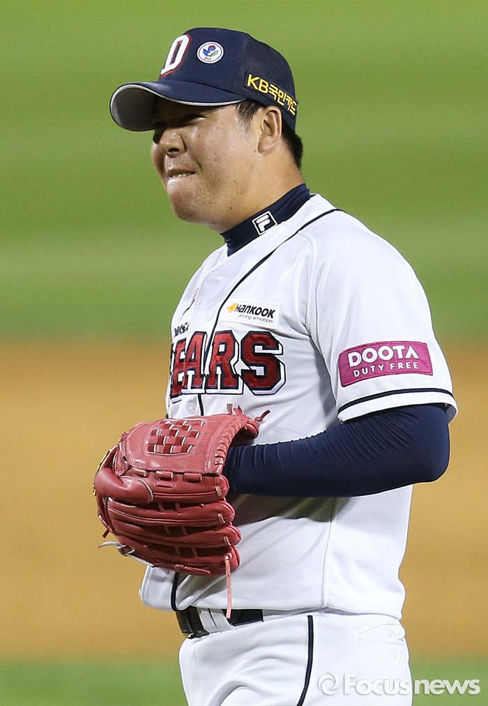 (서울=포커스뉴스) 3일 서울 잠실구장에서 열린 2016프로야구 SK-두산 경기에서 두산 마무리 투수 이현승이 9회 2사후 SK 박정권을 상대로 투구하다 발목을 다쳐 고통을 참으며 얼굴을 찡그리고 있다.