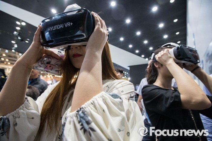 (부산=포커스뉴스) 3일 오후 부산 해운대구에 위치한 벡스코에서 열린 '2016 부산국제모터쇼'에서 관람객들이 현대 부스에 마련된 가상현실(VR) 체험을 하고 있다.