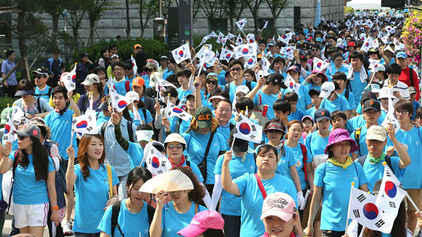 '나라사랑 고궁걷기대회'에 함께하고 싶다면 9일까지 공식홈페이지(www.hiwalking.co.kr)에서 온라인 참가 신청할 수 있다. 축제 당일 현장 부스에서 별도 접수할 수 있다. 참가비는 성인 1만원, 청소년 8000원이다.2013년 6월6일 열린 제6회 나랑사랑 고궁걷기대회 참가자들이 태극기를 흔들며 한껏 즐거워하고 있다. <사진출처=나라사랑 고궁걷기대회 홈페이지>