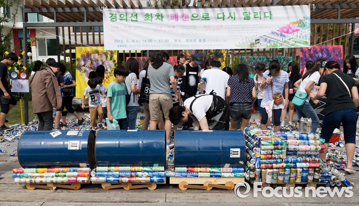 (서울=포커스뉴스) 4일 오후 서울 마포구 연남동 경의선 숲길에서 시민들이 버려진 음료캔으로 경의선 화물기차를 만들고 있다.