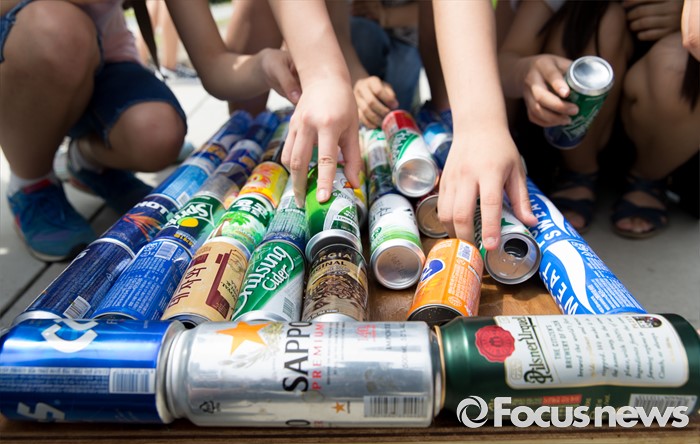 (서울=포커스뉴스) 4일 오후 서울 마포구 연남동 경의선 숲길에서 시민들이 버려진 음료캔으로 경의선 화물기차를 만들고 있다.