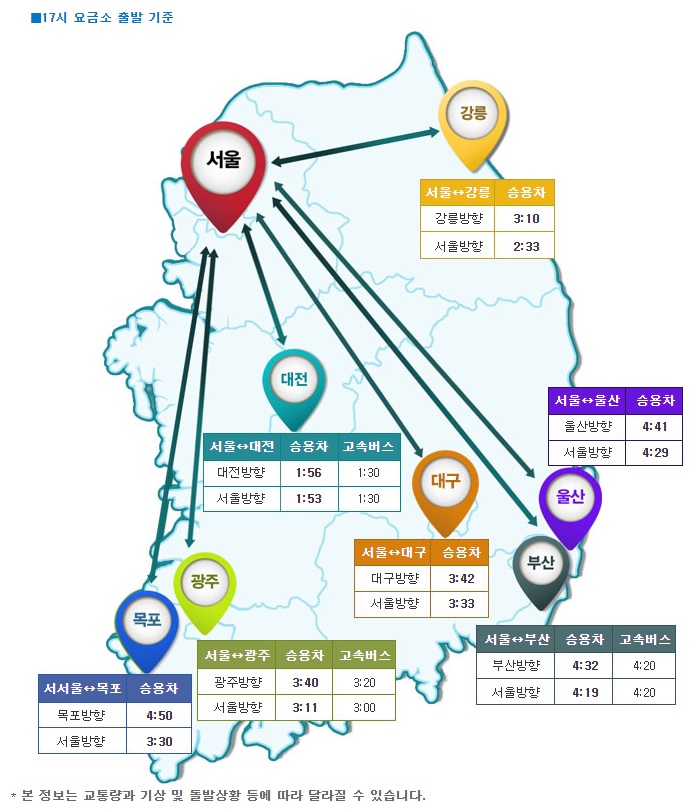 서울에서 주요도시까지 소요되는 시간은 오후 5시 기준 강릉 3시간 10분, 부산 4시간 32분, 광주 3시간 40분, 목포 4시간 50분, 대전 1시간 56분 등이다.