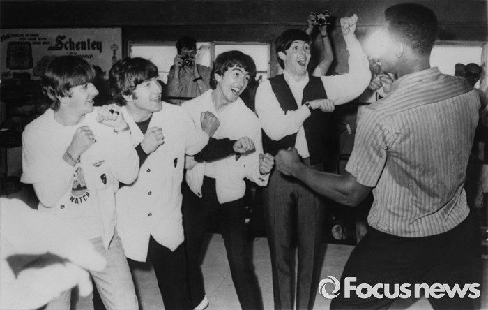 22nd February 1964:British pop group The Beatles, from left to right; Ringo Starr, John Lennon (1940 - 1980), George Harrison (1943 - 2001) and Paul McCartney; in the ring with champion American boxer Cassius Clay, whilst in Miami.(Photo by Keystone/Getty Images)