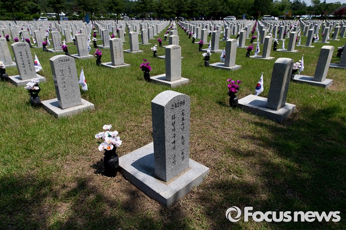 (서울=포커스뉴스) 현충일을 하루 앞둔 5일 오전 서울 동작구 국립서울현충원을 찾은 유족들이 묘역에 참배하고 있다.