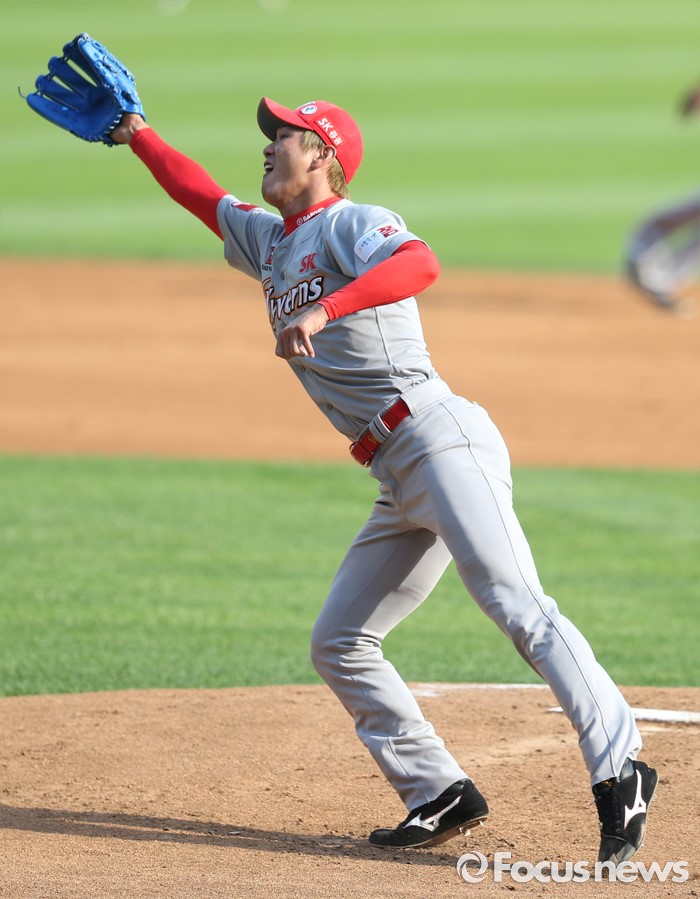 (서울=포커스뉴스) 5일 서울 잠실구장에서 열린 2016프로야구 SK-두산 경기에서 1회말 SK 선발투수 김광현이 두산 허경민의 타구를 잡으려 몸을 날리고 있다.