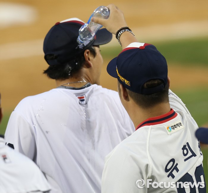 (서울=포커스뉴스) 5일 서울 잠실구장에서 열린 2016프로야구 SK-두산 경기에서 프로 진출 6년만에 첫 승을 올린 두산 투수 안규영에게 유희관이 축하의 물세례를 붓고 있다.