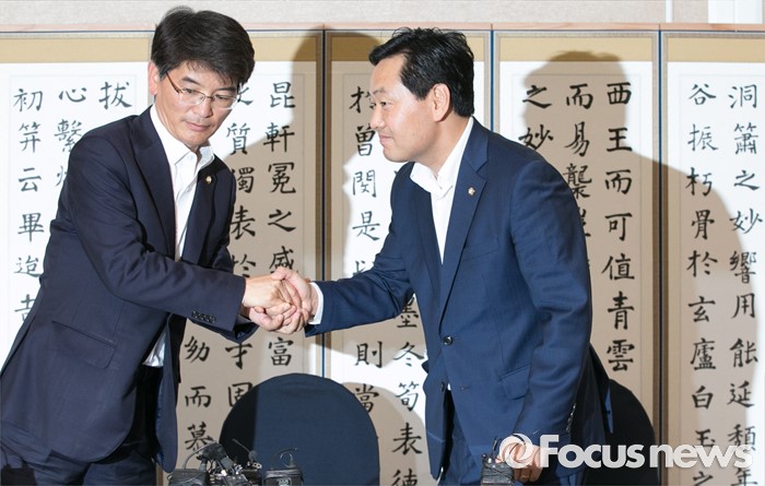 (서울=포커스뉴스) 6일 오후 서울 여의도 국회 귀빈식당에서 열린 20대 국회 원구성 협상 등을 위한 회동에 참석한 박완주(왼쪽) 더불어민주당 원내수석부대표, 김관영 국민의당 원내수석부대표가 인사하고 있다.