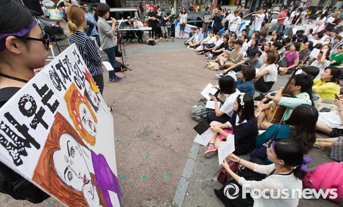 (서울=포커스뉴스) 6일 오후 서울 마포구 나루수산 앞 광장에서 열린 '여성 혐오에 저항하는 모두의 1차 공동행동-여성 혐오세상을 뒤엎자' 집회에 참석한 여성단체 회원이 여성 혐오를 규탄하는 손팻말을 들고 있다.