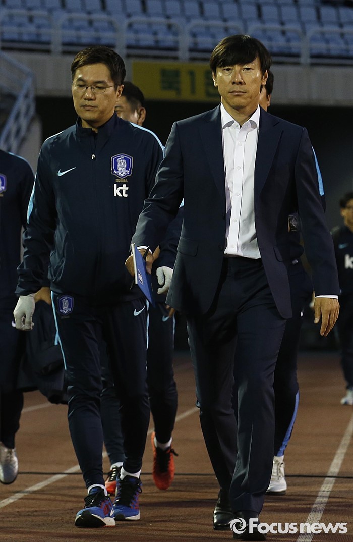 (부천=포커스뉴스) 6일 오후 경기 부천종합운동장에서 열린 2016 4개국 올림픽국가대표 축구대회 대한민국과 덴마크의 경기에서 대한민국 신태용 감독과 코치진들이 경기장에 들어서고 있다.