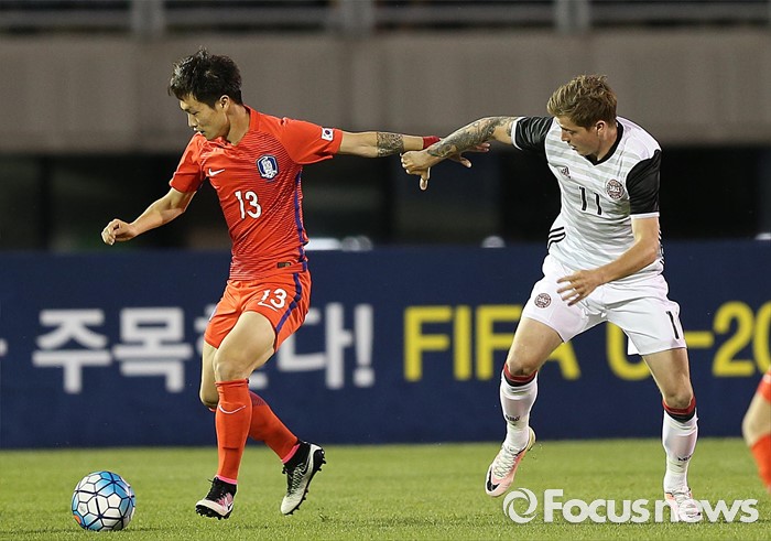 (부천=포커스뉴스) 6일 오후 경기 부천종합운동장에서 열린 2016 4개국 올림픽국가대표 축구대회 대한민국과 덴마크의 경기에서 대한민국 박동진이 상대 선수와 볼 다툼을 하고 있다.