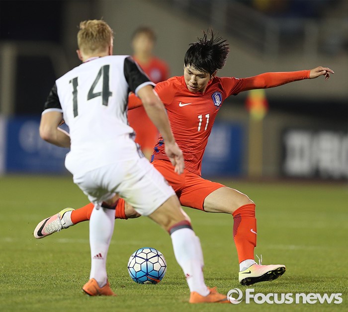 (부천=포커스뉴스) 6일 오후 경기 부천종합운동장에서 열린 2016 4개국 올림픽국가대표 축구대회 대한민국과 덴마크의 경기에서 대한민국 김승준이 패스하고 있다.