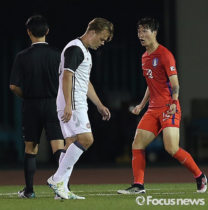 (부천=포커스뉴스) 6일 오후 경기 부천종합운동장에서 열린 2016 4개국 올림픽국가대표 축구대회 대한민국과 덴마크의 경기에서 대한민국 박동진이 심판의 판정에 항의하고 있다.