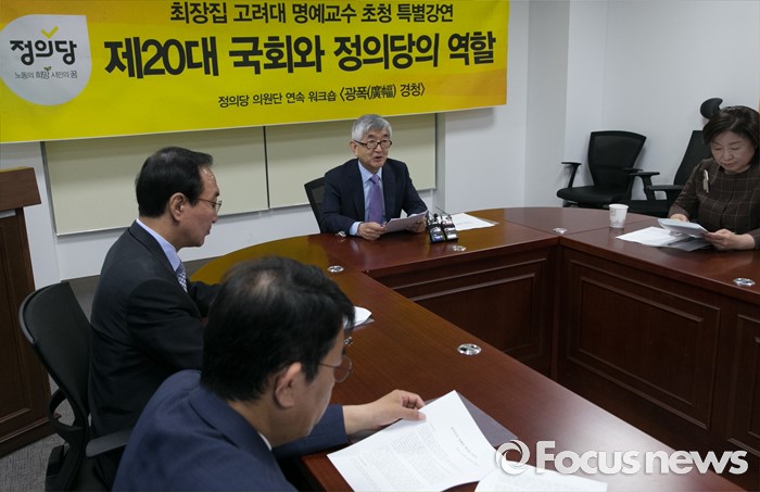 (서울=포커스뉴스) 7일 오전 서울 여의도 국회 의원회관에서 열린 정의당 광폭경청 초청강연에 참석한 최장집 고려대 명예교수가 발언하고 있다.