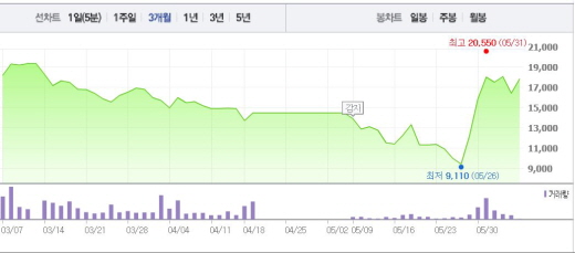 현대상선은 5월27일과 28일, 31일, 그리고 6월2일 각각 가격제한폭인 29.65%, 29.92%, 13.56%, 3.14%의 상승폭을 기록한 바 있다.