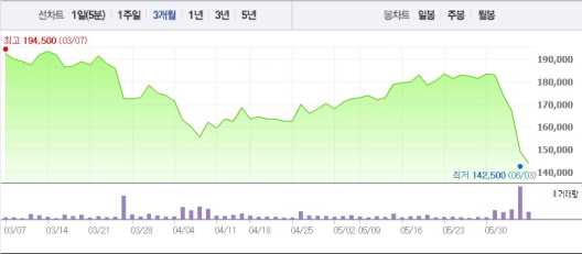 삼성SDS는 이날까지 5거래일 연속 하락세를 보이며 뚜렷한 하락곡선을 그리고 있다. 기관이 매도에 나서면서 5월31일부터 6월3일까지 1~10%의 낙폭을 기록했다.