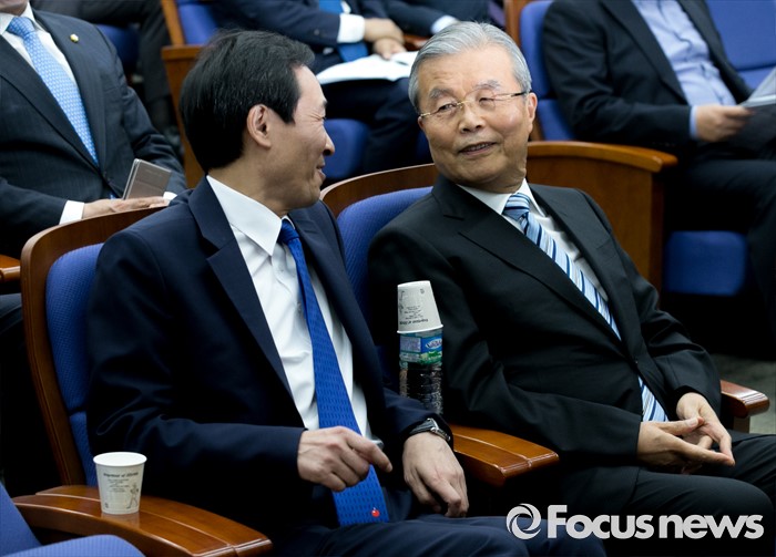 (서울=포커스뉴스) 7일 오전 서울 여의도 국회에서 열린 더불어민주당 의원총회에 참석한 김종인(오른쪽) 비대위 대표와 우상호 원내대표가 대화하고 있다.