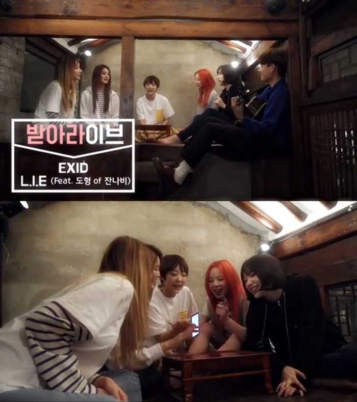 한편 EXID는 지난 1일 첫 정규 앨범 ‘스트리트(Street)’로 컴백, 타이틀곡 ‘L.I.E’로 국내외 음원차트를 1위를 휩쓸며 인기몰이 중이다.걸그룹 EXID가 지난 6일 공식 페이스북에 신곡 ‘엘라이(L.I.E)’를 어쿠스틱 버전으로 편곡한 라이브 영상을 게재했다. 사진은 영상 캡처.<사진제공=바나나컬쳐>