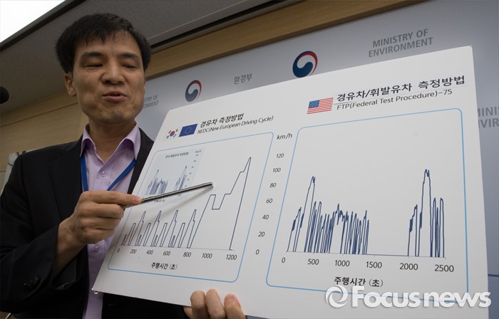 (세종=포커스뉴스) 홍동곤 환경부 교통환경과장이 7일 오전 세종시 정부세종청사 환경부 기자실에서 한국, 유럽연합, 미국의 경유차와 휘발류차 배출가스 측정방법에 대한 비교를 설명하고 있다.