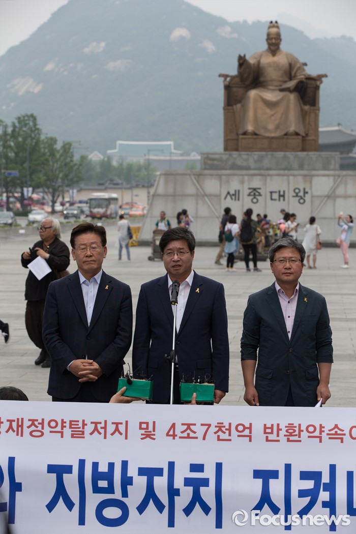 (서울=포커스뉴스) 7일 오전 서울 종로구 광화문광장에서 이재명(왼쪽부터) 성남시장, 염태영 수원시장, 채인석 화성시장이 정부의 지방재정개편안에 반대하는 단식농성 기자회견을 열고 있다.