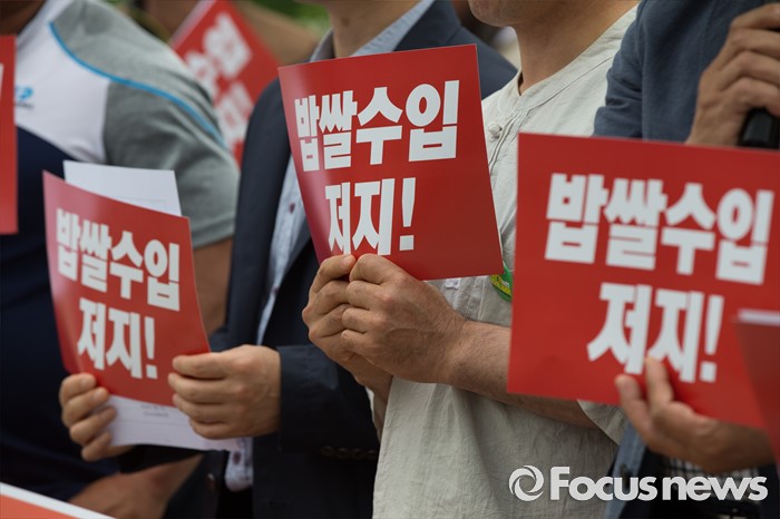 (서울=포커스뉴스) 7일 오후 서울 여의도 국회 정문 앞에서 전국농민회총연맹 회원들이 밥쌀 수입 강행하는 박근혜 정부 규탄 기자회견을 열고 있다.
