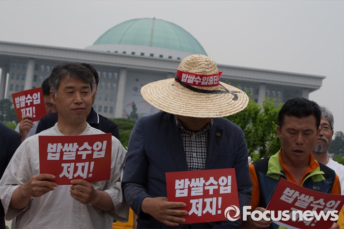 (서울=포커스뉴스) 7일 오후 서울 여의도 국회 정문 앞에서 전국농민회총연맹 회원들이 밥쌀 수입 강행하는 박근혜 정부 규탄 기자회견을 열고 있다.