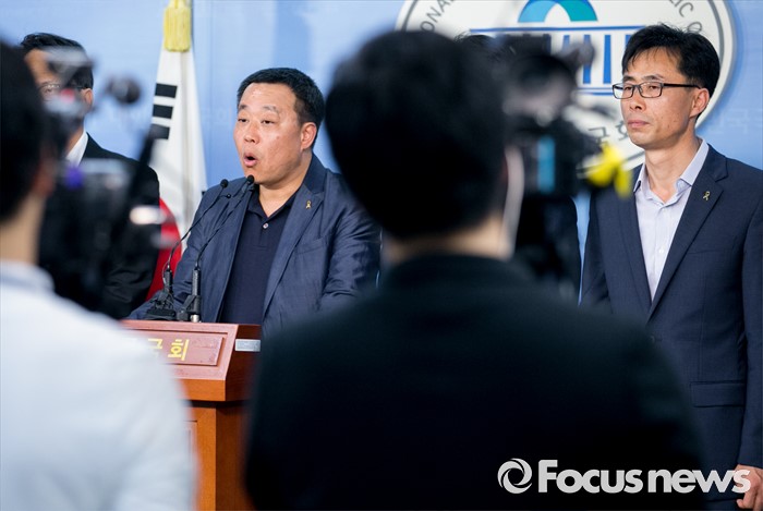 (서울=포커스뉴스) 박주민 더불어민주당 의원과 윤소하 정의당 의원, 전명선 4·16가족협의회 운영위원장, 유경근 집행위원장 등이 7일 오후 서울 여의도 국회 정론관에서 세월호 특별법 개정안 발의 기자회견을 하고 있다.