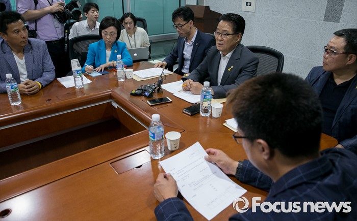 (서울=포커스뉴스) 박지원 국민의당 원내대표가 7일 오후 서울 여의도 국회 의원회관에서 세월호 특별법 개정안과 관련 전명선 4·16가족협의회 운영위원장, 유경근 집행위원장 등 관계자들과 면담을 하고 있다.