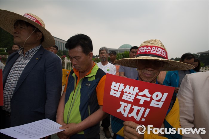 (서울=포커스뉴스) 7일 오후 서울 여의도 국회 정문 앞에서 전국농민회총연맹 회원들이 밥쌀 수입 강행하는 박근혜 정부 규탄 기자회견을 열고 있다.