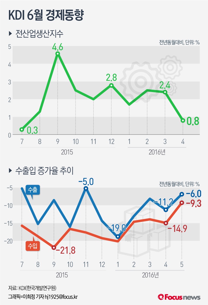 (서울=포커스뉴스) 7일 한국개발연구원(KDI)이 공개한 ‘6월 경제동향’에 따르면 경기 전반이 다소 위축됐다는 판단이다. 5월 중 수출 현황을 보면 전년동기대비 –6.0%의 증가율을 기록했고 4월 전산업생산지수는 전년동기대비 0.8%에 머물렀다.