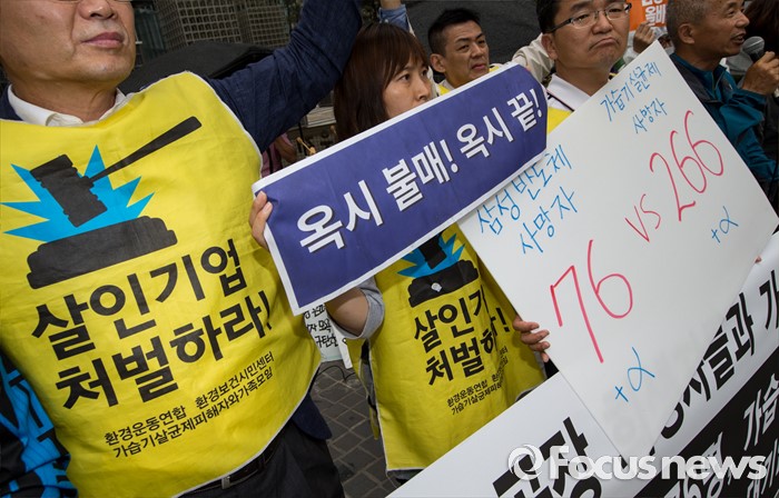 (서울=포커스뉴스) 7일 오후 서울 서초구 삼성전자 사옥 앞에서 열린 '반도체 공장 희생자들과 가습기살균제 피해자들 연대 기자회견'에서 가피모 및 반올림 회원들이 정부 및 기업의 책임을 촉구하는 구호를 외치고 있다.