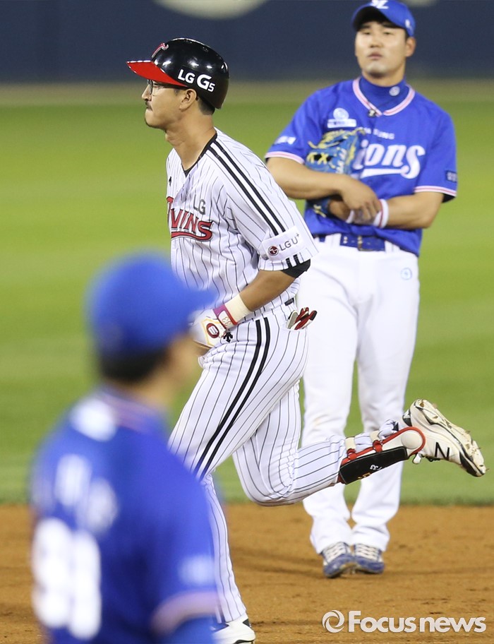 (서울=포커스뉴스) 8일 서울 잠실구장에서 열린 2016 프로야구 삼성-LG 경기 7회말 LG 박용택이 선두타자로 나와 우월 솔로 홈런을 치고 그라운드를 달리고 있다.