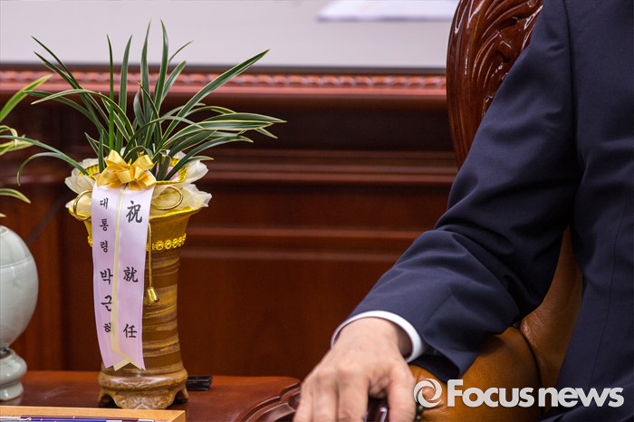 (서울=포커스뉴스) 10일 오전 서울 여의도 국회의장실에 이원종 대통령 비서실장이 정세균 국회의장에게 전달한 박근혜 대통령 축하 난이 놓여 있다.