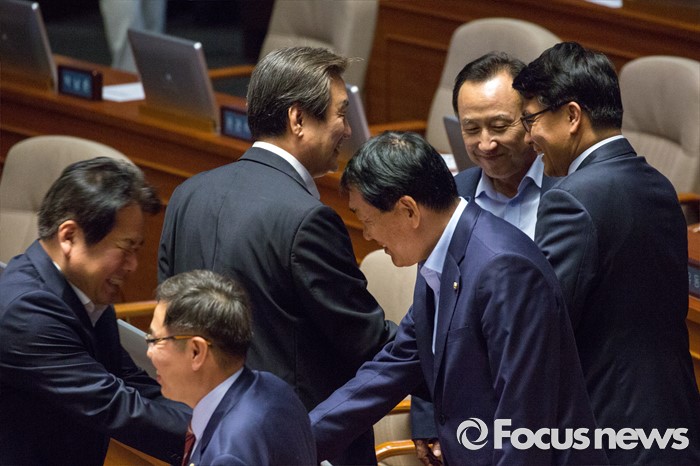 (서울=포커스뉴스) 김무성 새누리당 전 대표가 9일 오후 서울 여의도 국회에서 열린 본회의에 참석해 동료의원들과 인사 하고 있다.