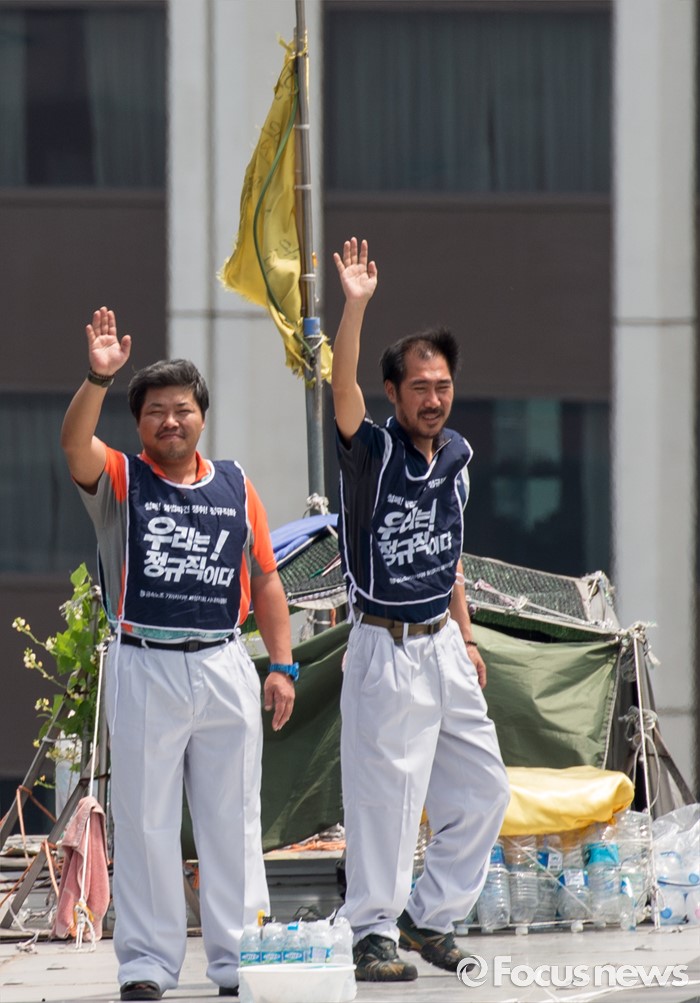 (서울=포커스뉴스) 8일 오후 서울 을지로 옛 국가인권위원회 옥상 광고탑에서 기아자동차 비정규직 노동자의 정규직화를 요구하며 363일 동안 고공농성을 벌인 한규협(왼쪽)씨와 최정명씨가 취재진을 향해 인사하고 있다.