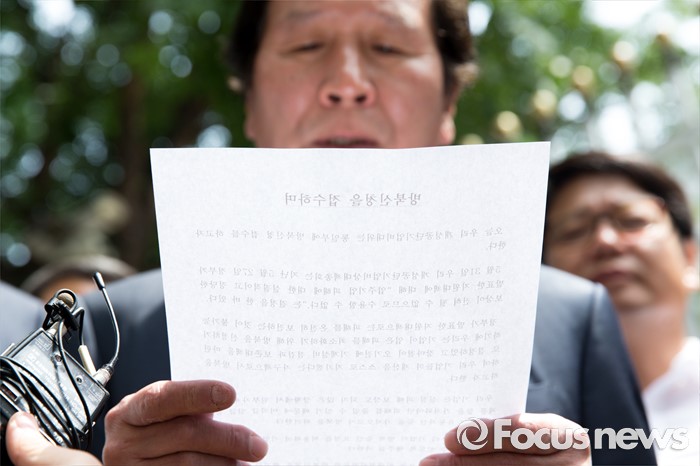 (서울=포커스뉴스) 8일 오전 서울 종로구 정부서울청사 앞에서 정기섭 개성공단기업 비상대책위원회 위원장이 통일부에 방북 신청서 제출 전 기자회견문을 낭독하고 있다.