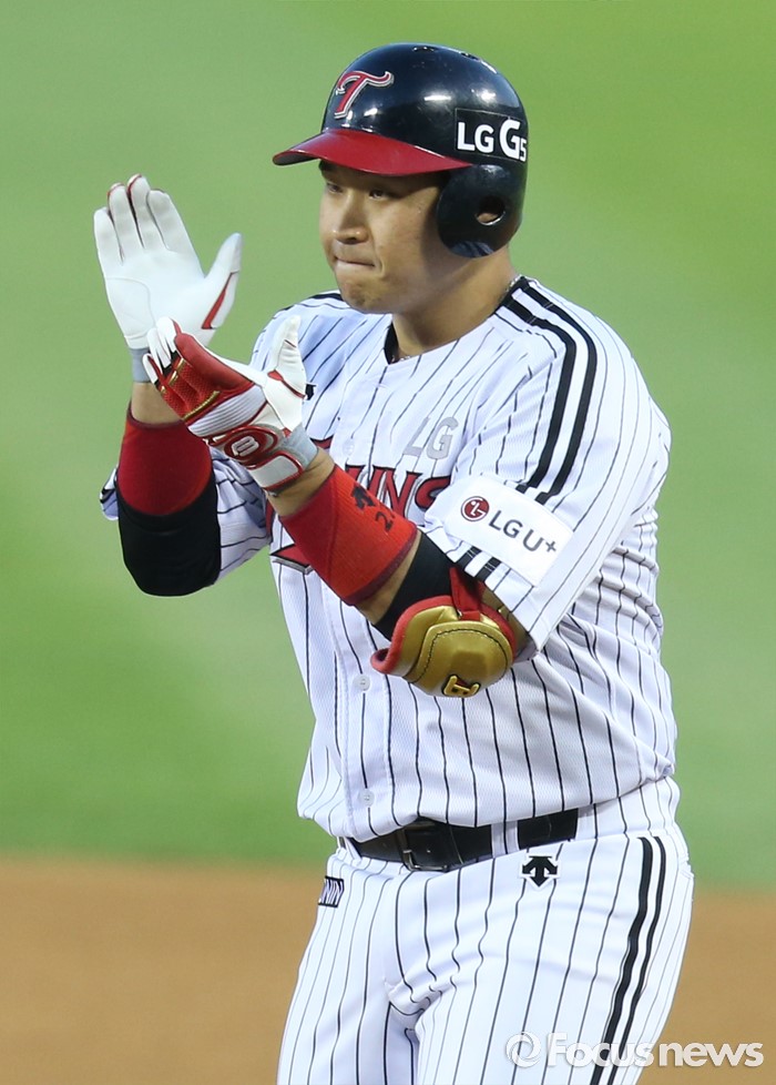 (서울=포커스뉴스) 8일 서울 잠실구장에서 열린 2016 프로야구 삼성-LG 경기 3회말 2사 만루에서 LG 유강이 2타점 좌전 안타를 치고 1루에서 박수치고 있다.