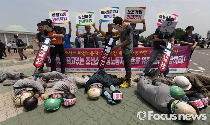 (서울=포커스뉴스) 8일 오전 서울 여의도 국회 앞에서 민주노총 금속노조 조합원들와 조선소 하청업체 직원들이 구조조정 중단과 고용안전 대책을 요구하는 퍼포먼스를 하고 있다.